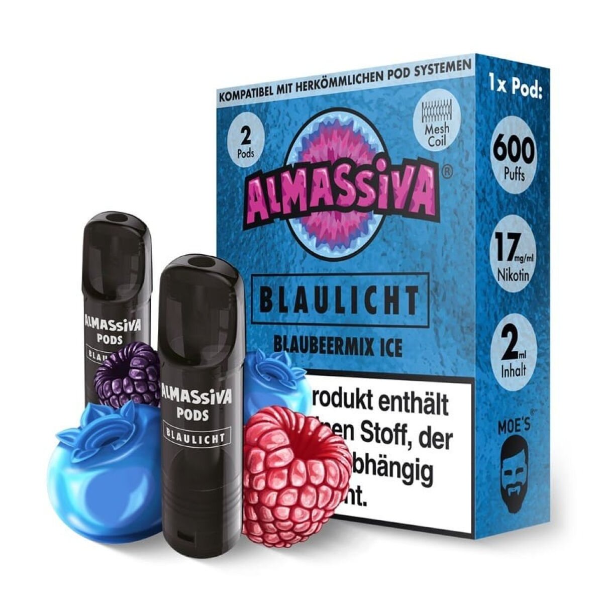 Der Al Massiva Blaulicht Pod liefert einen intensiven, fruchtig-frischen Mix aus aromatischer Blaubeere, spritziger Zitrone und einem erfrischenden Ice-Finish. Die Kombination wirkt klar, fruchtig und belebt den Geschmack bei jedem Zug. Pro Packung erhältst du 2 vorbefüllte Pods mit 17 mg/ml Nikotinsalz – vollständig ELFA-kompatibel.