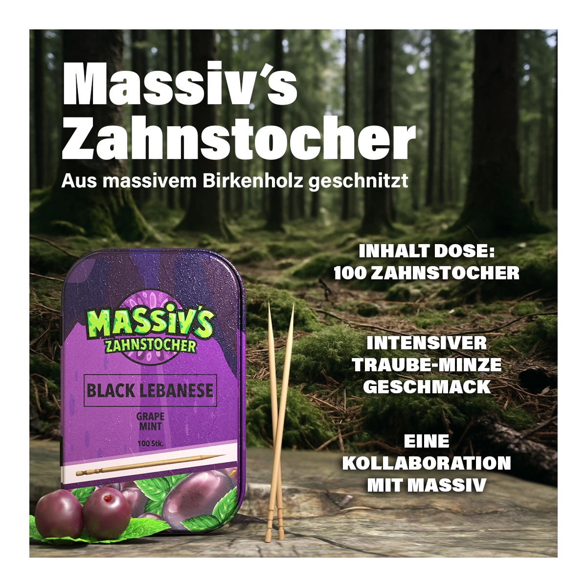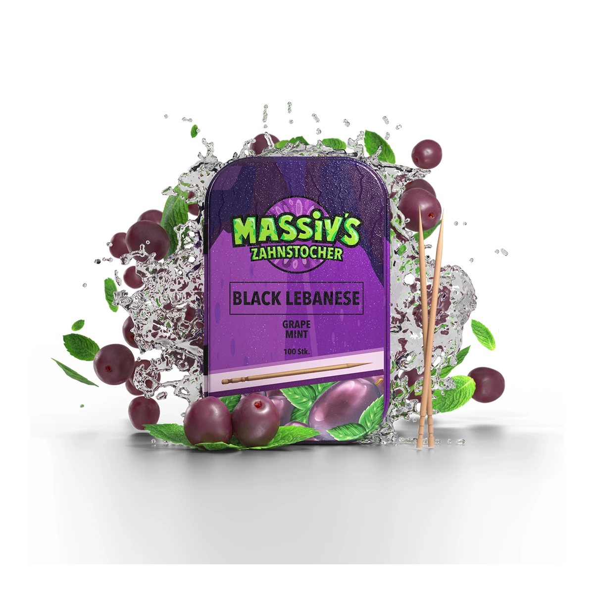Die Massiv's Zahnstocher Black Lebanese überzeugen durch ihr markantes Design, inspiriert von Rapper Massiv, und ein intensives Aromaprofil aus Traube und Minze.